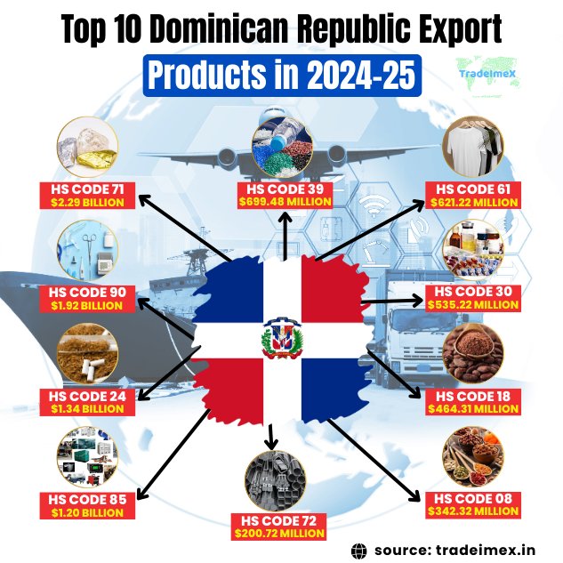 The Dominican Republic is renowned for its diverse range of top export products that play a significant role in its economy. The top 10 Dominican Republic export products encompass a mix of agricultural goods, textiles, precious metals, and more. Leading the pack is gold, showcasing the country's mineral wealth, closely followed by medical instruments, tobacco, and cigars, reflecting the craftsmanship and expertise of its workforce. The top 10 exports of Dominican Republic, as per the Dominican Republic customs data and export data by HS code for 2024-25, include:
