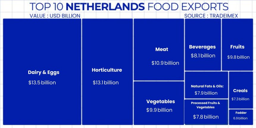 The Netherlands may be a small country in size, but when it comes to food exports, it's a true powerhouse. The Netherlands is the 2nd largest food exporter in the world and the largest food exporter in Europe. The Netherlands food exports by country reveal the nation’s strong position as one of the world’s leading agricultural exporters. In fact, recent Netherlands agriculture statistics highlight how this small but efficient country continues to dominate global markets with high-value Netherlands agriculture products such as vegetables, dairy, flowers, and meat. The total Netherlands agricultural exports value reached impressive figures in the past year, driven by advanced farming techniques, technology, and a strategic logistics network. Notably, the Netherlands food exports value continues to grow, with key markets including Germany, Belgium, the UK, and France, showcasing the country’s role in feeding millions across Europe and beyond.